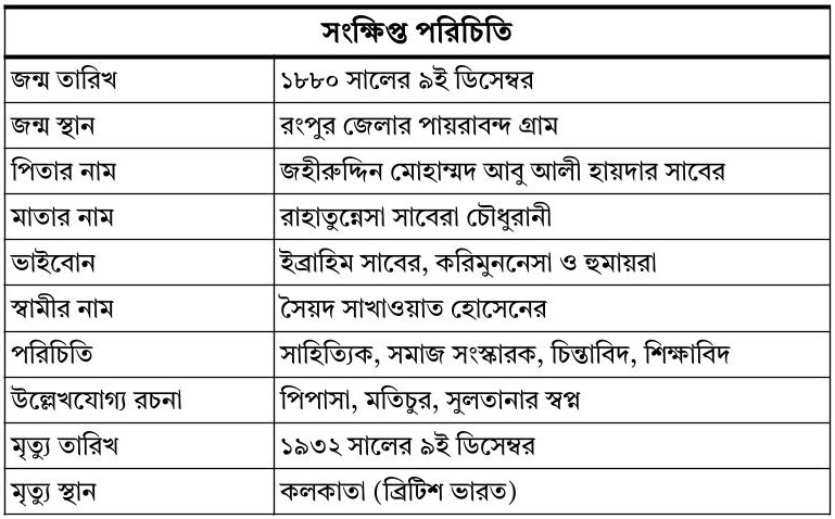 বেগম রোকেয়ার জন্ম ৯ই ডিসেম্বর ১৮৮০ সালের রংপুর জেলার পায়রাবন্দ গ্রামের এক অভিজাত বংশে। তাঁর পিতার নাম জহীরুদ্দিন মোহাম্মদ আবু আলী হায়দার সাবের, ছিলেন একজন শিক্ষিত জমিদার। তাঁর মাতার নাম রাহাতুন্নেসা সাবেরা চৌধুরানী। জহীরুদ্দিন মোহাম্মদ আবু আলী হায়দার সাবের চার স্ত্রীর মধ্যে প্রথমা ছিলেন রাহাতুন্নেসা সাবেরা চৌধুরানী। রোকেয়ার বড় ভাই ইব্রাহিম সাবের এবং দুই বোন করিমুননেসা ও হুমায়রা। বাঙালি মুসলমান সমাজ যখন সামাজিক কুসংস্কার ও ধর্মীয় প্রতিবন্ধকতায় আবদ্ধ ছিল সেই সময় তিনি জন্ম গ্রহণ করেন। তার পিতা আবু আলী হায়দার সাবের বিভিন্ন ভাষায় পারদর্শী হলেও মেয়েদের শিক্ষার ব্যাপারে ছিলেন রক্ষণশীল। বড় দুই ভাই বোনের সহযোগিতায় তিনি গোপনে শিক্ষালাভ ও সাহিত্যচর্চা করেন। সেহেতু তাঁর প্রাতিষ্ঠানিক শিক্ষার সুযোগ ঘটেনি। রোকেয়ার শিক্ষার সূচনা ঘটে মোমবাতির আলোকে বড় ভাই ইব্রাহিম সাবেরের তত্ত্বাবধানে। তিনি তাঁর ভাইবোনের অনুপ্রেরণাতেই বিভিন্ন ভাষা শেখেন এবং বিভিন্ন বিষয়ে জ্ঞান অর্জন করেন। তিনি সর্বদাই ঘরের চার দেওয়ালের বাইরে মুক্ত আকাশে শিক্ষালাভ করতে চেয়েছিলেন। কিন্তু তাঁর এই স্বপ্ন কোনো দিন পূরণ হয়নি। কিন্তু তাঁর সার্থকতা এখানেই যে, যখন সমগ্র মুসলমান নারী সমাজ কুসংস্কারে আবদ্ধ ঠিক সেই সময়ে তিনি শিক্ষাচর্চা ও জ্ঞান আহরণে মগ্ন ছিলেন। ১৮৯৮ সালে বিহারের ভাগলপুরের সৈয়দ সাখাওয়াত হোসেনের সাথে বিবাহবন্ধনে আবদ্ধ হন। তিনি ছিলেন ডেপুটি ম্যাজিস্ট্রেট। সৈয়দ সাখাওয়াত হোসেন ছিলেন একজন উদার মানসিকতাসম্পন্ন ব্যক্তি। স্বামীর সুদূরপ্রসারী প্রভাবের কারণেই তার জ্ঞানচর্চার পরিধি বিস্তৃত হয়। ইংরেজি ভাষার দক্ষতা অর্জনের পাশাপাশি দেশ-বিদেশে লেখকদের রচনার সাথে পরিচিতি ঘটতে থাকে। ১৯০৯ সালে স্বামী মারা গেলে বেগম রোকেয়া নিঃসঙ্গ হয়ে পড়েন। এবং তাঁর মৃত্যু হয় ৯ ডিসেম্বর ১৯৩২, কলকাতা (ব্রিটিশ ভারত)।